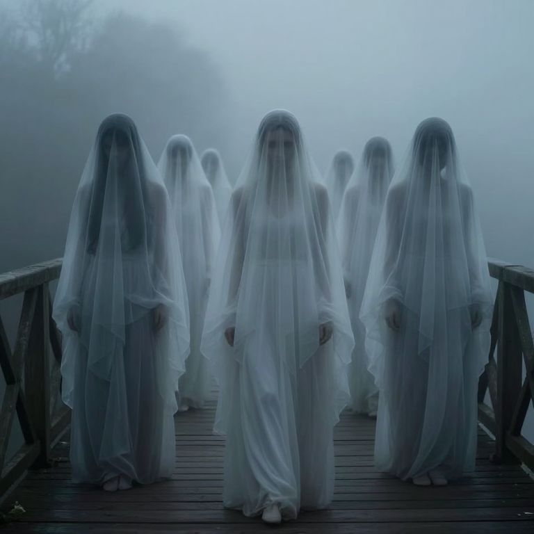 Veiled figures stand in silent procession across a mist-shrouded bridge, their ethereal forms draped in the whispers of lost dreams and forgotten melodies, evoking a haunting symphony of memory and melancholy.