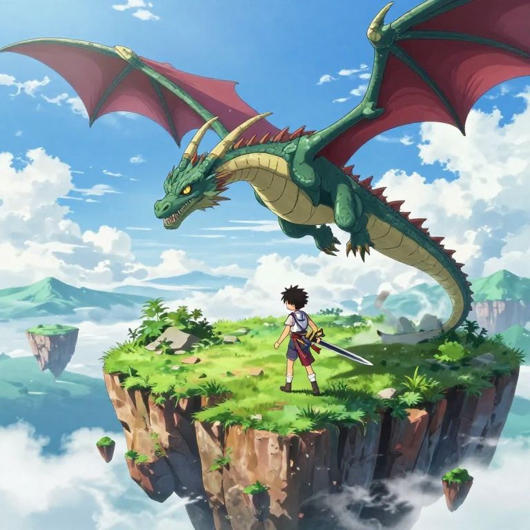 Design an anime fantasy scene with a dragon flying over a floating island, bright clear sky, lush greenery, young anime adventurer with spiky hair and sword, vibrant colors, dynamic composition, high detail, whimsical and epic mood