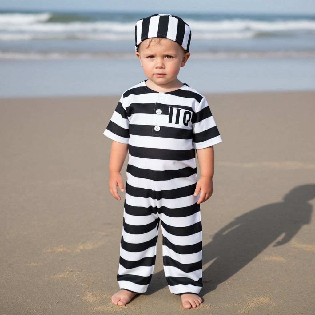 Toddler Deluxe Button Down Jailbird Costume Boy, boy in a black and white striped shirt and hat standing on a beach