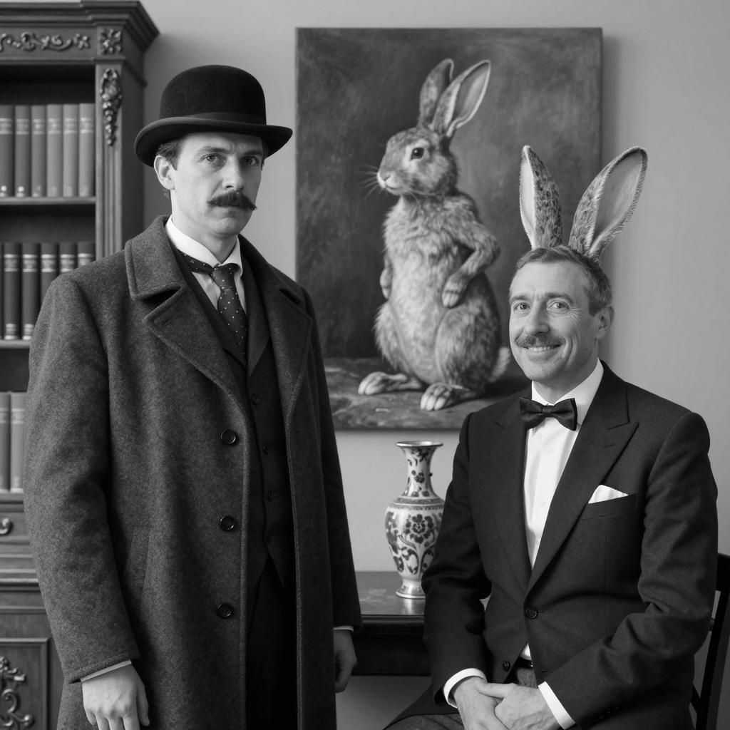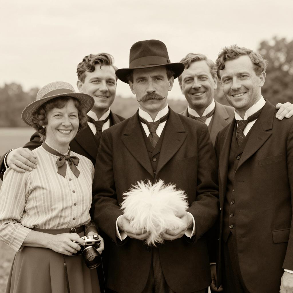 Sepia photograph of six people in early 20th-century attire. Central man with mustache, dark suit, and hat holds fluffy white object. Woman on left wears striped blouse, hat, and smiles, holding camera. Man on right in dark suit, smiling. Other people in background smile. Everyone has arms around each other. Background includes blurred outdoor elements.