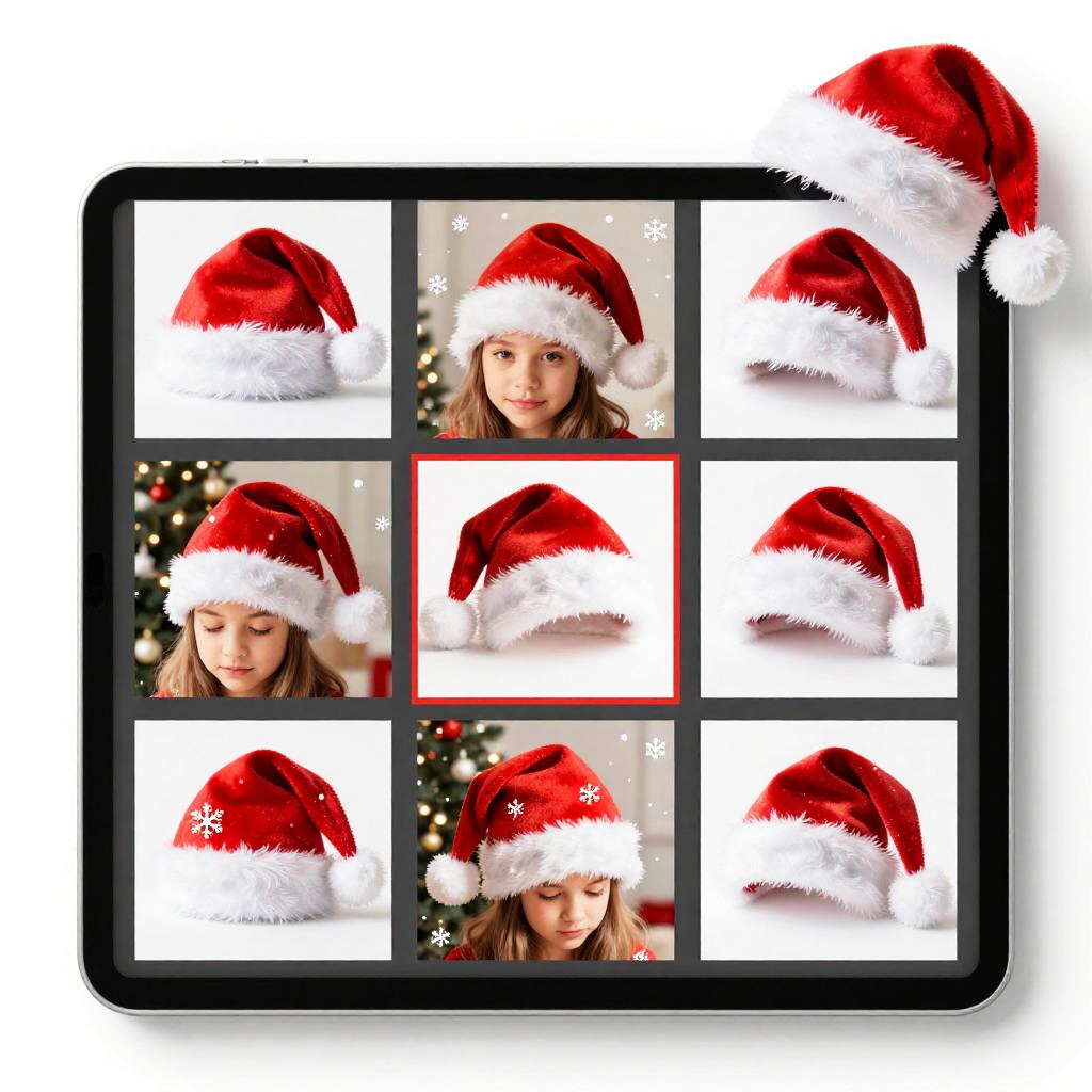 Santa hat editor tool interface with a cheerful holiday theme, featuring a digital workspace where users can customize and place vibrant red and white Santa hats on photos, surrounded by festive decorations and snowflakes.