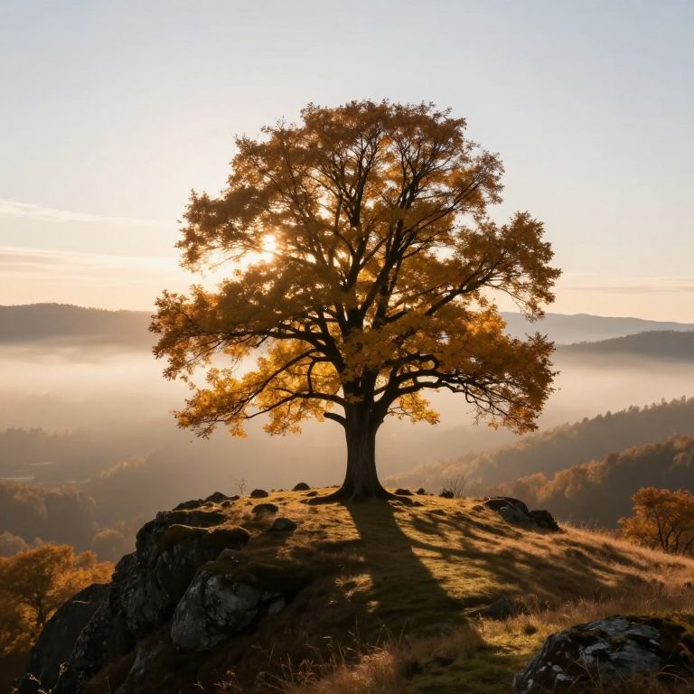 Photograph of a solitary, large oak tree with golden autumn leaves standing on a rocky hilltop at sunrise. The tree's shadow stretches across the grassy ground, which is dotted with small rocks. The background features a misty valley with rolling hills and a distant forest, all bathed in soft, warm sunlight. The sky is clear with a gentle gradient from pale blue to light yellow. The image has a serene, tranquil atmosphere, highlighting the beauty of nature.