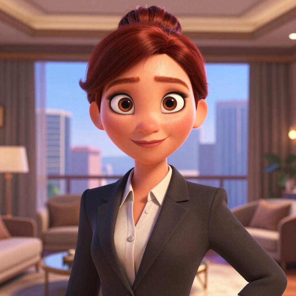 Disney Pixar animation, sharp eyes focus, redhead, athletic body, alone, ((woman in formal business suit)), (((ultra realistic detailed eyes))), intricate eye details, Big eyes, confident smile, sweaty, model shoot pose, ultra skin texture, ((ultra skin details)), skin imperfections, intricate details, (in luxury penthouse), sleek bun