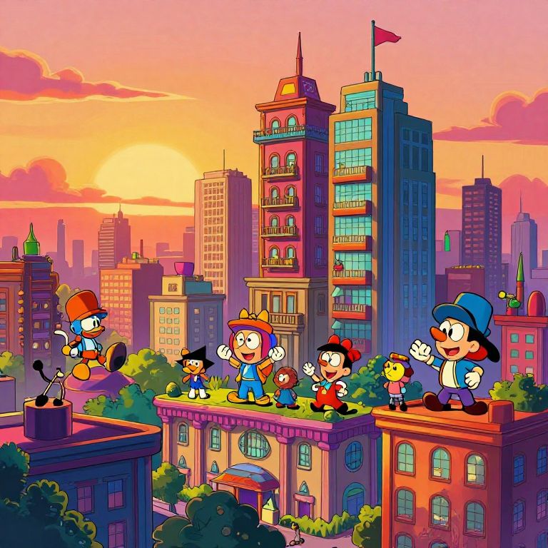 Cartoonized vibrant cityscape at sunset, exaggerated features with bold outlines, bright colors, whimsical buildings and playful characters, dynamic composition, smooth shading, lively atmosphere, inspired by classic animation styles