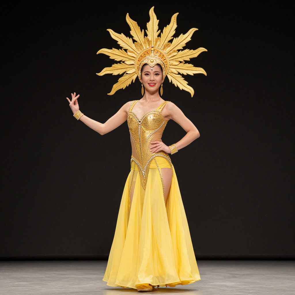Photograph of an Asian woman in a vibrant yellow costume, standing on a black stage. She wears a radiant, sun-like headdress with golden, sunray-like extensions. Her strapless, golden gown has intricate beadwork on the bodice and a flowing, tulle skirt with a high slit. She has red lipstick, dark eyeliner, and her hair is styled under the headdress. Her right hand is raised with a graceful pose, and her left hand rests on her hip. She wears a golden bracelet on her right wrist. The background is plain black, emphasizing her bright costume.