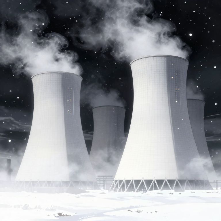 This digital drawing features three tall, cylindrical cooling towers against a dark, starry night sky. The towers are illuminated with a bright, white light, creating a stark contrast against the dark background. White steam rises from the top of each tower, blending with the dark sky. The towers have a ribbed texture, and their bases are surrounded by a geometric, lattice-like structure. Small stars are scattered across the sky, adding to the night-time atmosphere. The overall style is futuristic and somewhat monochromatic, emphasizing the contrast between the bright towers and the dark surroundings.