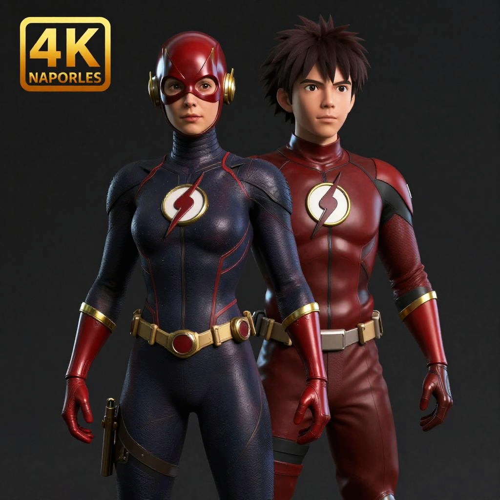Realistic photo.Hyperrealistic photography of a merged character inspired by Flash mixed with Quicksilver, styled in the manner of Masashi Kishimoto, Hayao Miyazaki, and Yoshiyuki Sadamoto. Captured in a full-shot, 4K resolution, with highly detailed, cinematic lighting. Rendered in a photorealistic 3D style with Octane Render, Unreal Engine, and studio lighting, achieving award-winning quality in sharp focus at 8K resolution. The composition combines dark, intense textures with studio refinement, highlighting both characters’ unique elements. realistic photo