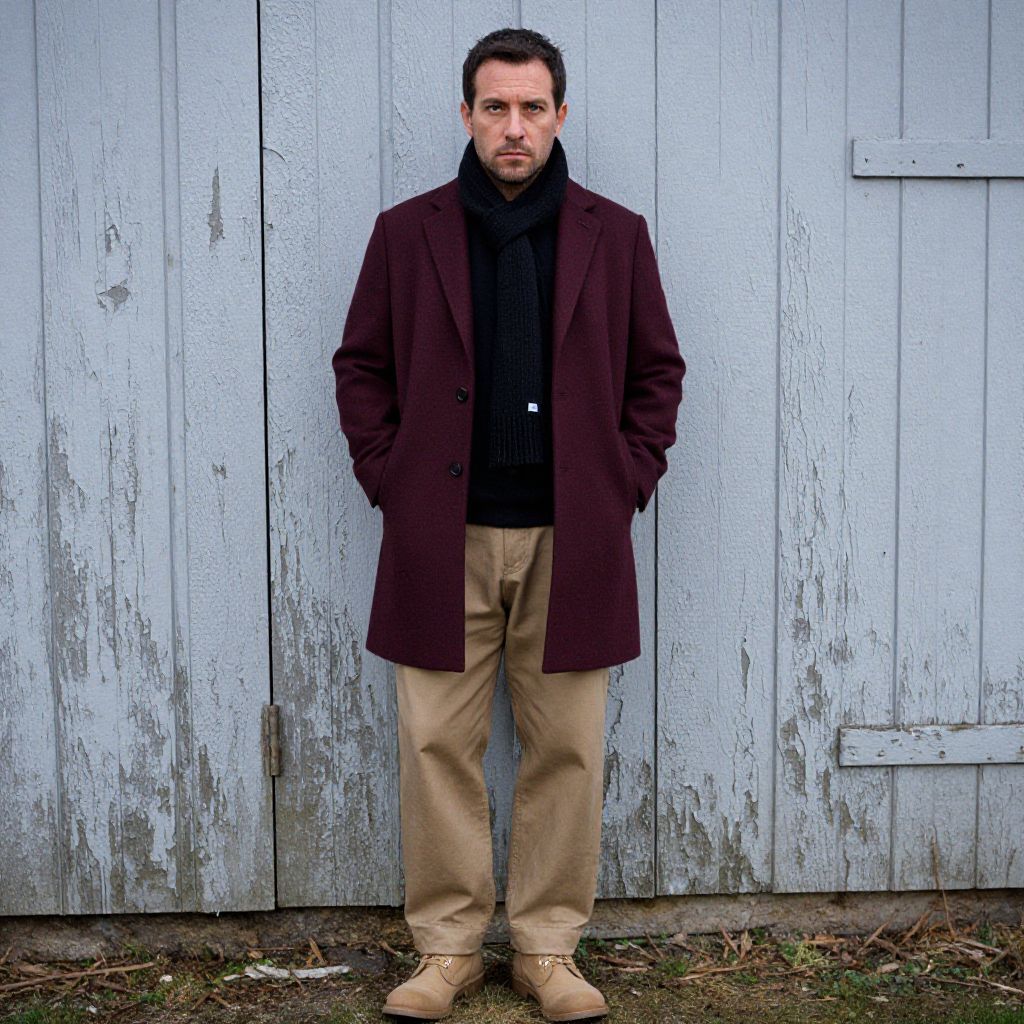 A man, burgundy wool blend overcoat, black crew neck sweatshirt, relaxed-fit khaki chinos, tan desert boots, long black scarf, weathered barn with peeling paint, AgfaColor film, contemplative expression. Man has masculine face and piercing eyes