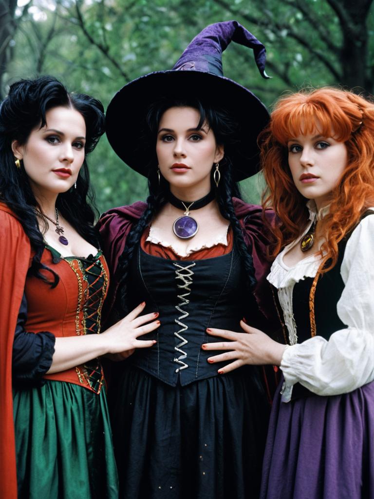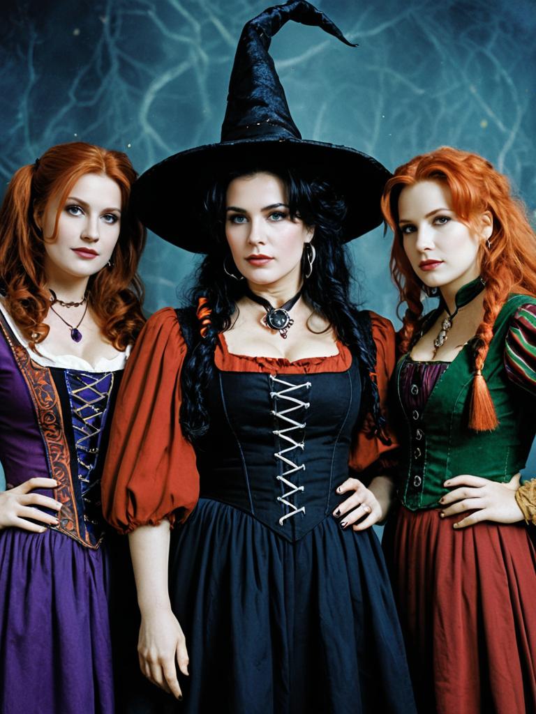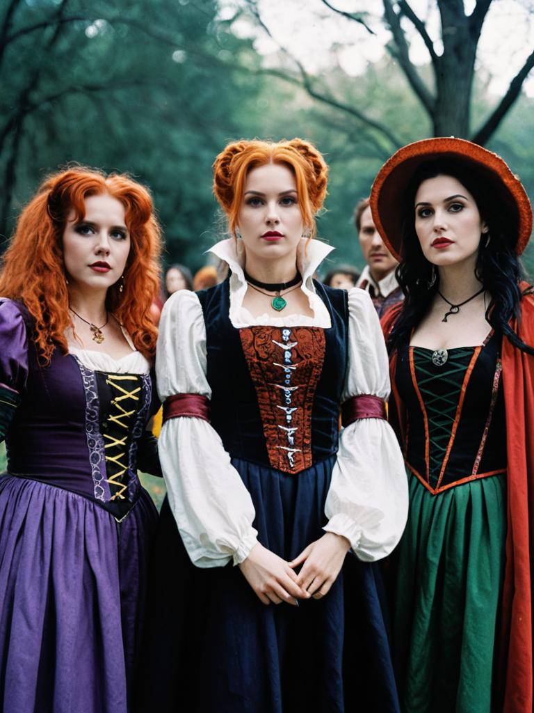Group in Hocus Pocus Cosplay, waist-up editorial portrait, photorealistic tones