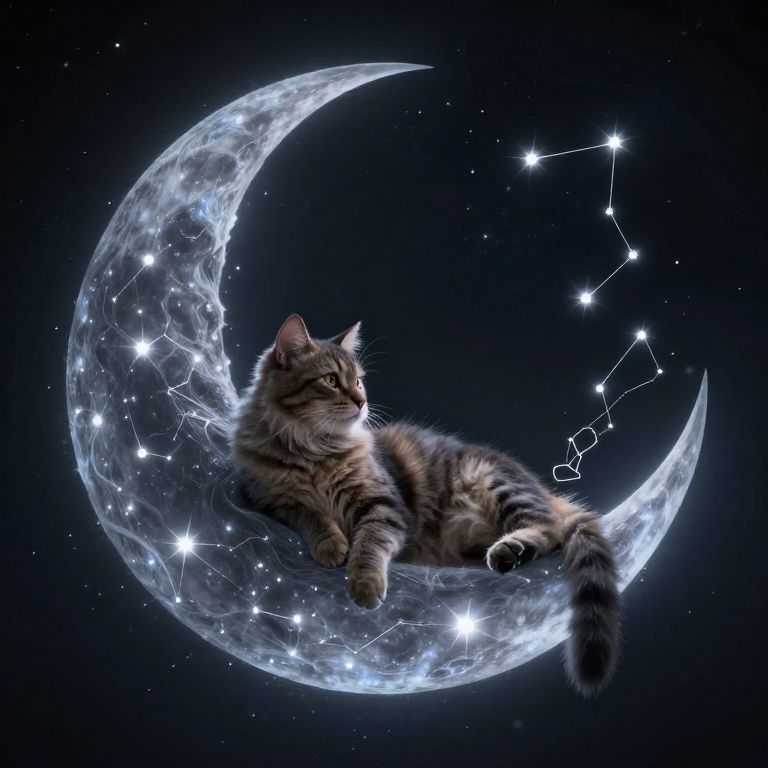 A celestial cat lounges lazily on the crescent moon, tendrils of stardust weaving around its tail to form constellations.