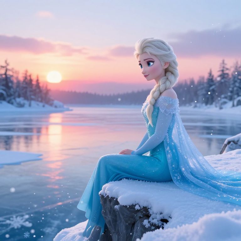 Digital art of Elsa from Frozen, sitting on a snow-covered rock by a frozen lake at sunset, wearing an ice-blue gown, with snowflakes