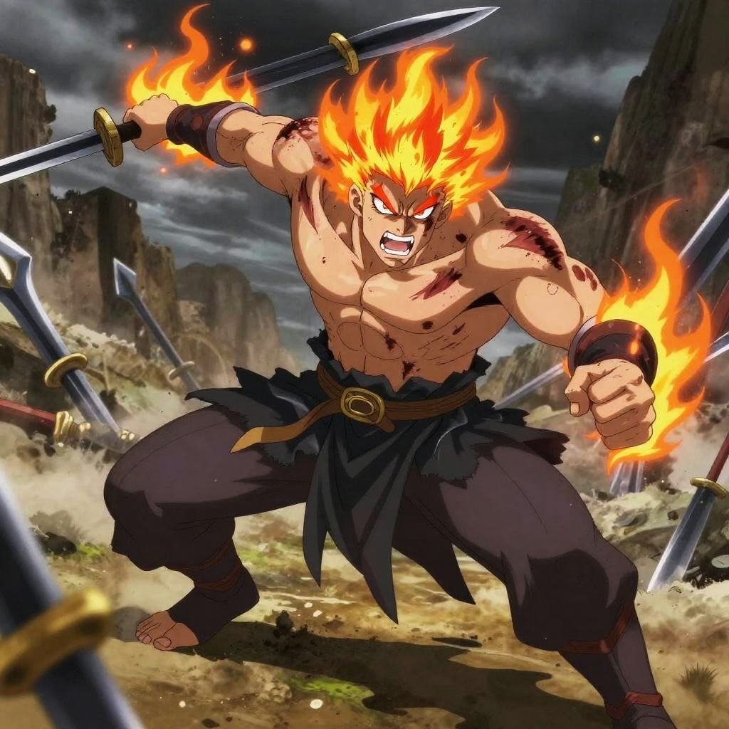A fierce berserker warrior, with scarred muscular build and wild fiery eyes, performing charging with roaring battle fury, set in a thunderous battlefield strewn with broken weapons, depicted in the dynamic and magical anime style of Hiroyuki Takei.