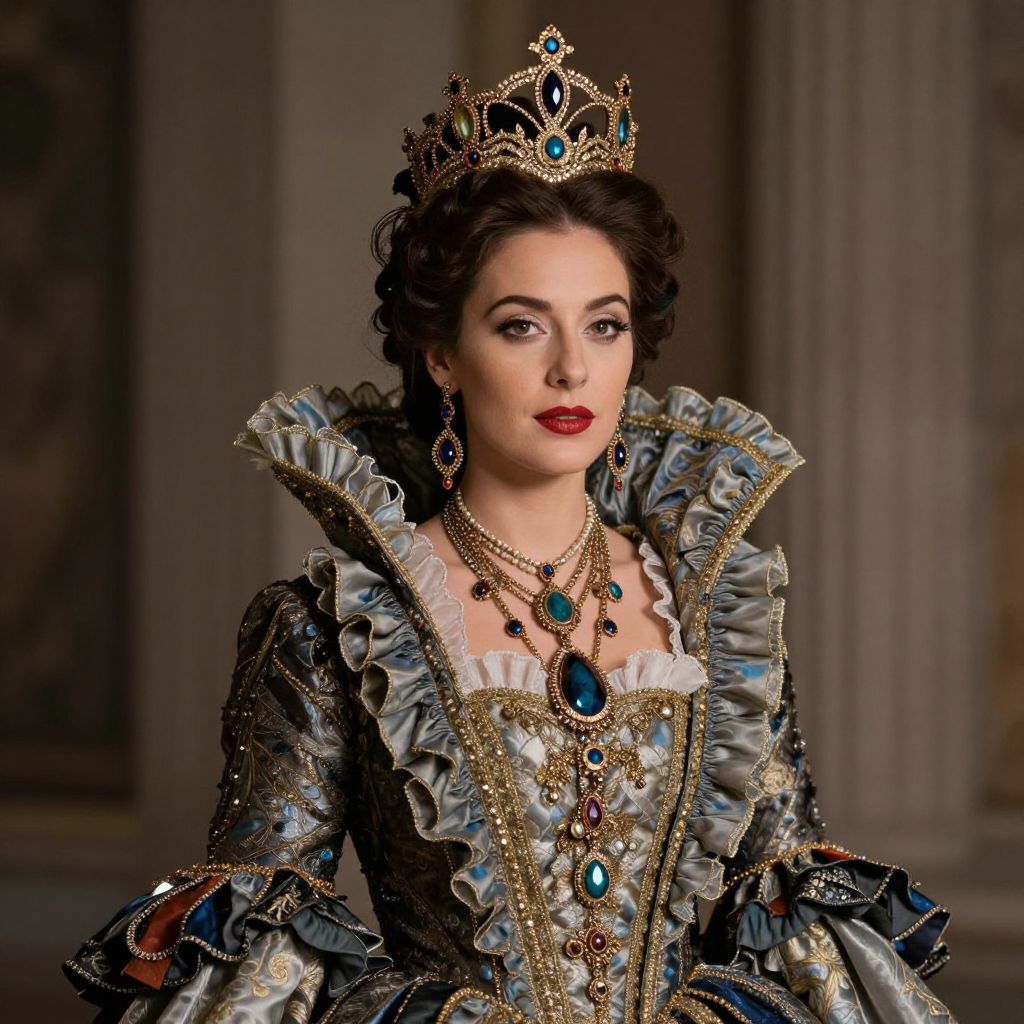 This striking image features a woman adorned in an elaborate costume, showcasing a blend of vintage and high-fashion aesthetics. Her regal crown and ornate jewelry complement the dramatic ruffles of her outfit, creating a captivating visual reminiscent of a royal court or a theatrical performance.
