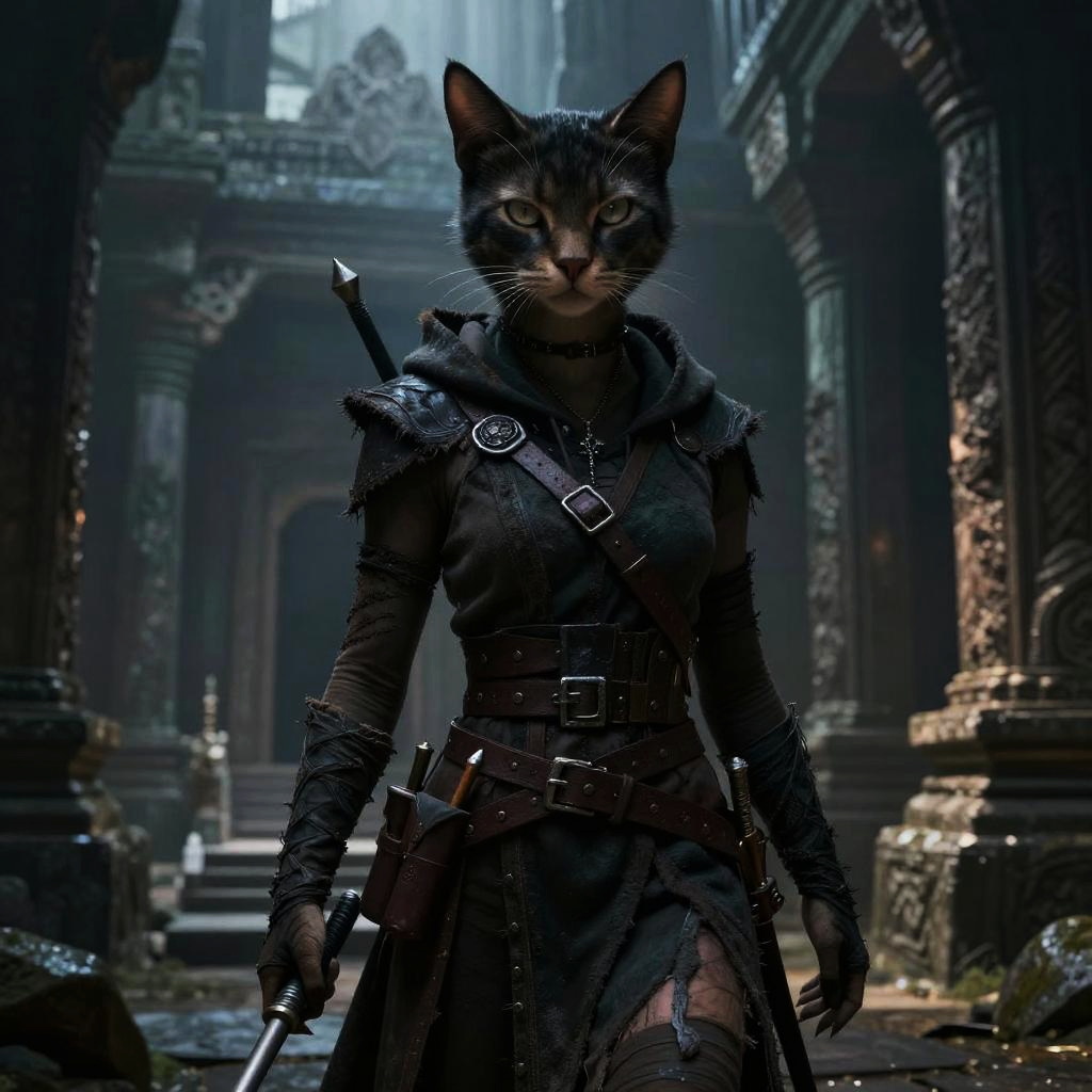 Female catfolk art portraying a mysterious rogue cat-human hybrid blending into shadows of an ancient ruined temple, sleek dark fur, piercing eyes glowing faintly, dressed in stealthy, weathered garments with hidden weapons, atmospheric moody lighting, detailed fantasy environment.