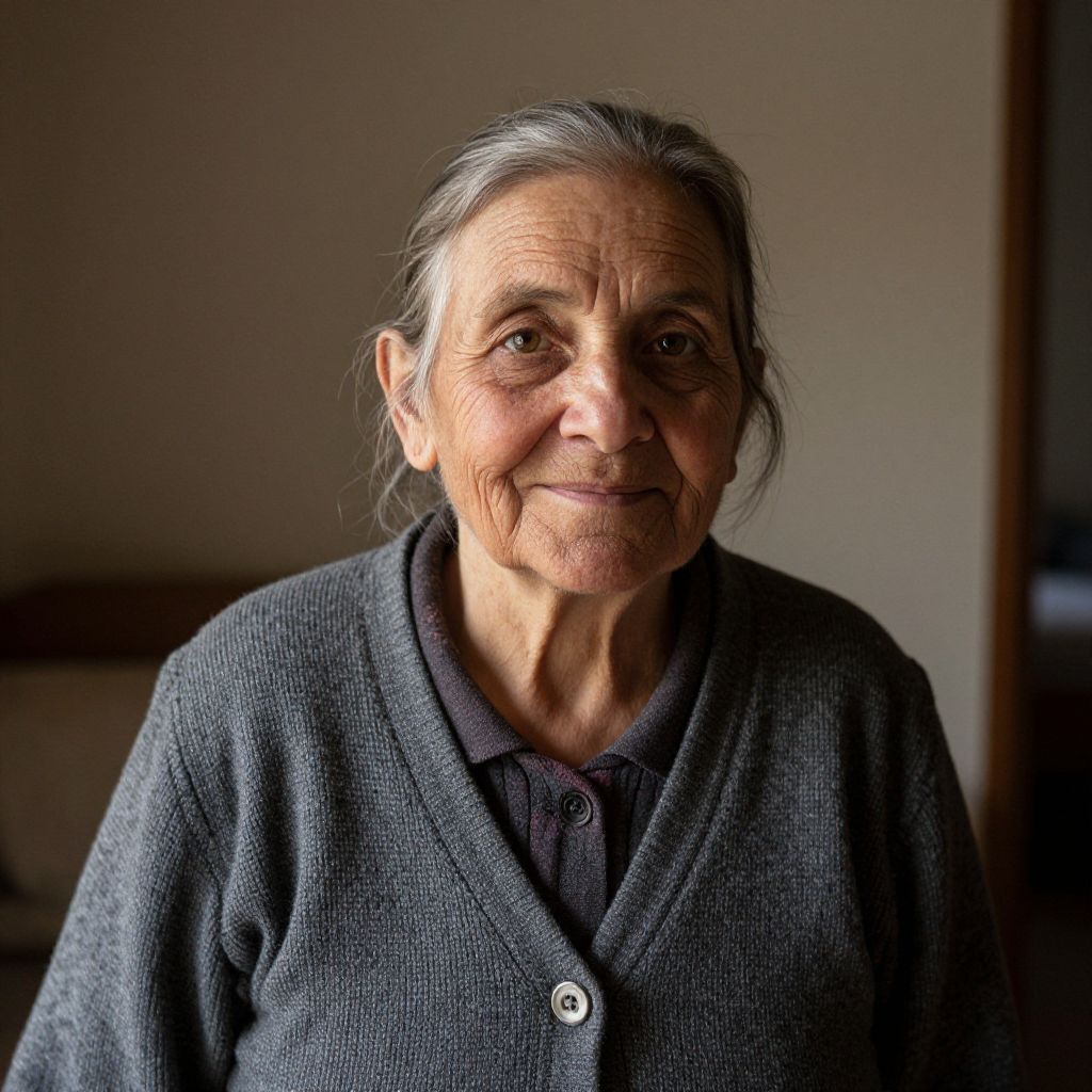 An enduring spirit of resilience and warmth radiates from the gentle visage of an elderly woman, her weathered features a testament to a life rich with stories, as she stands in the quiet embrace of home, surrounded by the comforting textures of memory and tradition.