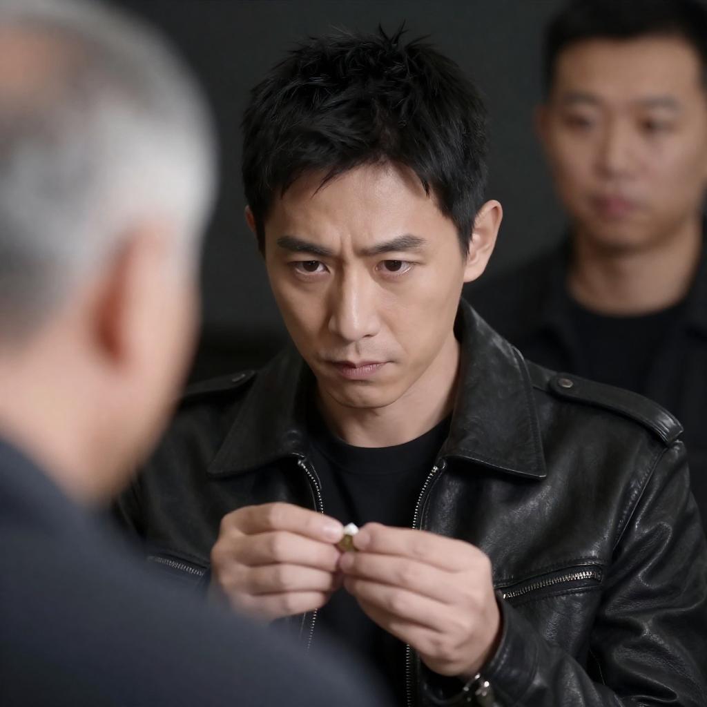 Photograph of a man with short black hair, intense gaze, wearing a black leather jacket, focused on a small object in his hands. Blurred white-haired person in foreground. Dark, blurred background. Two people, man's serious expression.