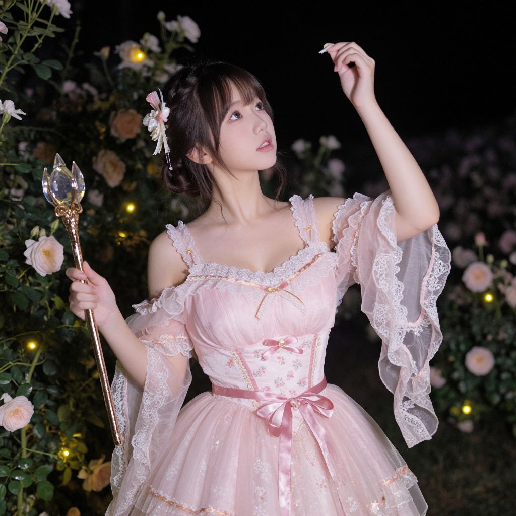 Photograph of an East Asian woman with fair skin, medium build, and dark brown hair styled in a loose updo with a white flower clip. She wears an off-the-shoulder, pale pink lace dress with a fitted bodice, ribbon sash, and voluminous skirt. Her dress features delicate white lace sleeves and a floral pattern. She holds a crystal ball-tipped staff in her right hand and raises her left hand gracefully. The background is dark, adorned with blooming pink and white roses and small, glowing yellow fairy lights, creating a magical, fairytale-like atmosphere. The lighting highlights her dress and face.