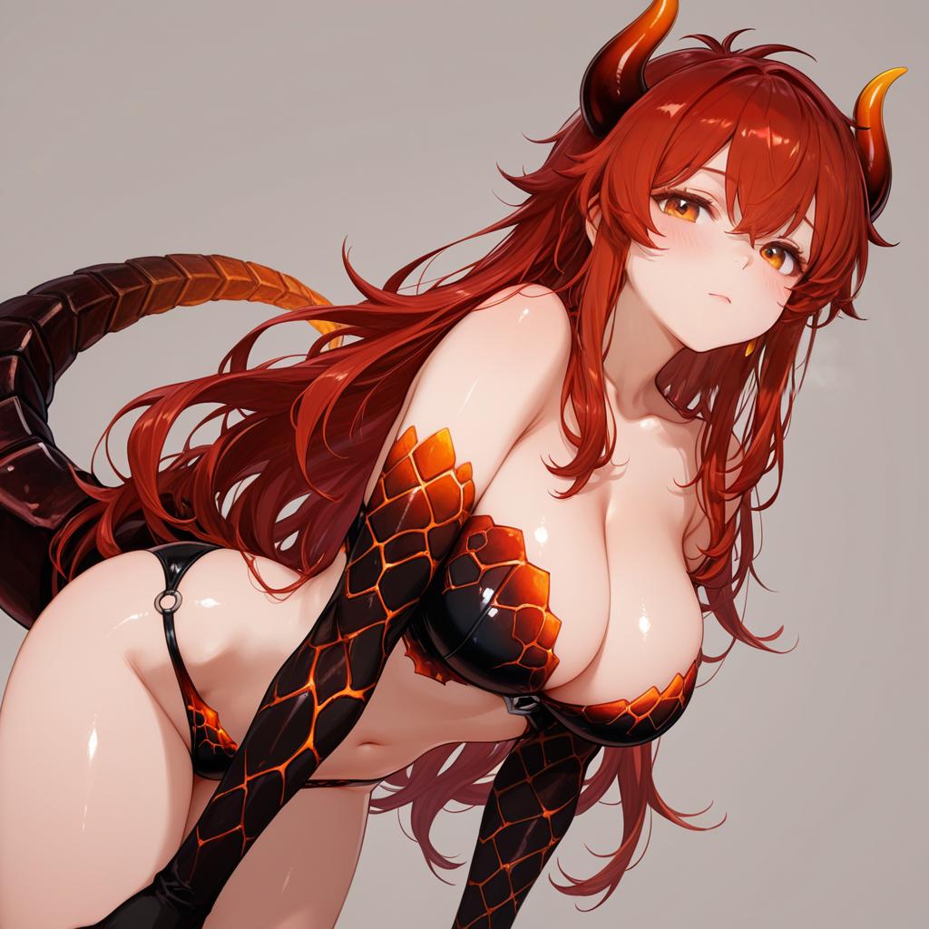 Dola (nijisanji), nijisanji, 1girl, dragon horns, dragon tail, red eyes, hair between eyes, red hair, long hair, very long hair, large breasts, huge breasts, cleavage, navel, virtual youtuber, virtual youtuber, dragon girl, by artist 7010, dark_illustrious