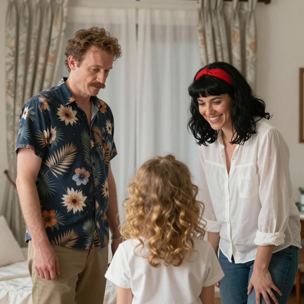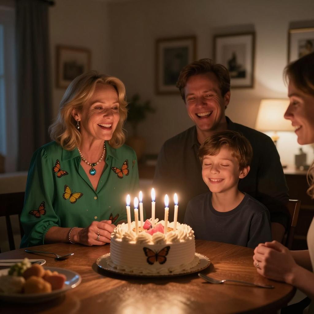 A warm family birthday celebration in a dimly lit room. A young boy with light brown hair sits at the table smiling with eyes closed in front of a white birthday cake adorned with lit candles and butterfly decorations. A blonde woman wearing a green blouse with butterfly patterns and a turquoise necklace, along with a man with short brown hair, smile and laugh joyfully. Another woman is partially visible on the right, watching the celebration. The cozy background shows framed pictures and a table lamp.