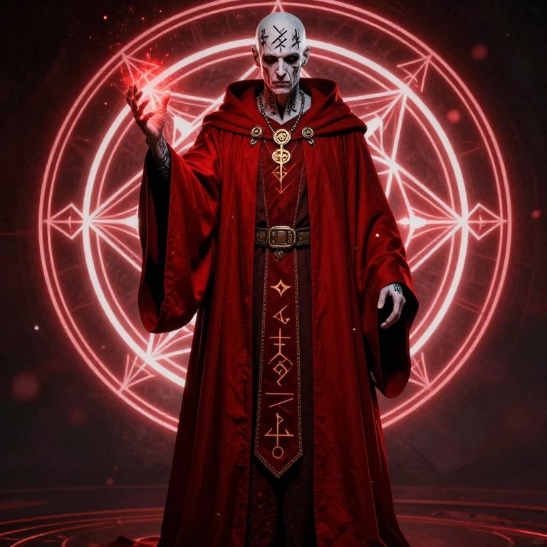 A digital illustration of a menacing figure in a long, red hooded robe with intricate black runes on the front. The figure has a pale, skull-like face with dark, empty eyes and a sinister expression. They hold a glowing red magical flame in their right hand. The background features a large, glowing red pentagram with radiating lines. The figure stands on a black, reflective surface, adding to the dark, mystical atmosphere. The overall style is dark fantasy, with a strong, ominous red and black color scheme.