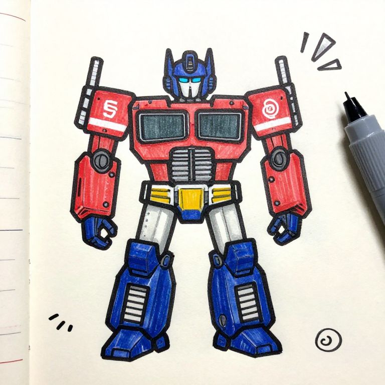 Transformer easy drawing, hand-drawn style sketch of a friendly transformer robot with bold black outlines, colored with soft markers, emphasizing ease of drawing with minimal details, placed on lined sketchbook paper with doodle style elements around.