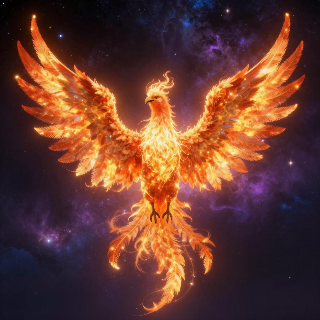 Vivid digital artwork of a flaming phoenix with outstretched wings glowing in bright orange and yellow hues. The mythical bird is set against a cosmic starry background featuring purple and blue galactic elements, symbolizing energy, rebirth, and mystical light effects.