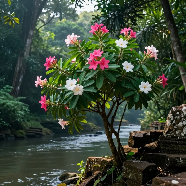 A vibrant lote plant growing on ancient ruins by a tranquil river, lush green leaves, bright pink and white flowers, magical morning light filtering through dense jungle foliage, cinematic composition with high detail and depth.