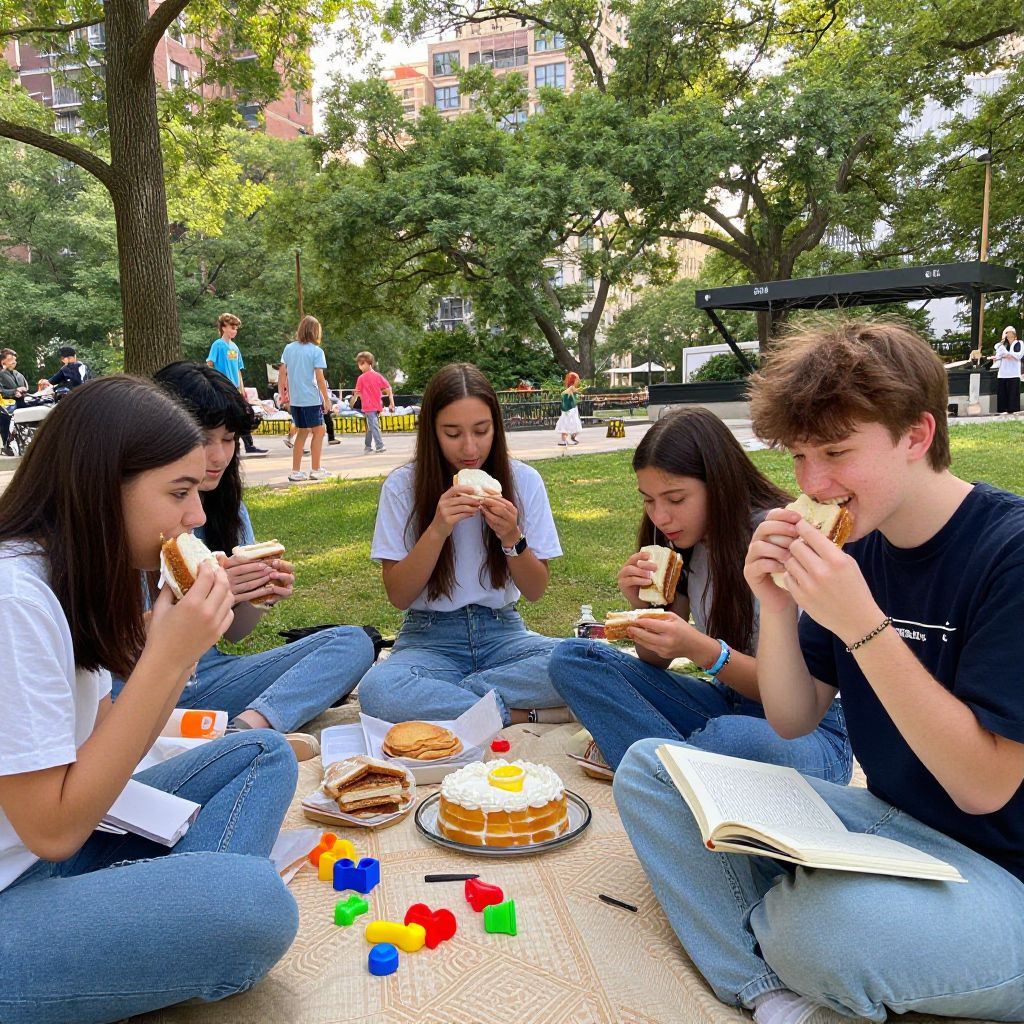 A picnic vibe in a scenic city park with a group of college students eating sandwiches and sharing a homemade lemon cake, one student with a freckled face and messy brown hair is smiling while holding a book, colorful wind-up toys scattered around, trees with green leaves, children playing nearby, warm afternoon sun, clean and cheerful atmosphere