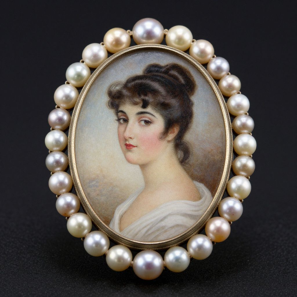 Photograph of a vintage portrait brooch featuring a painted woman with dark hair in an updo, wearing white, surrounded by large pearls against a black