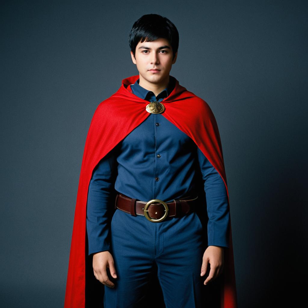 Big tall costume,1boy, solo, male focus, realistic, cape, looking at viewer, standing, black hair, short hair, pants, closed mouth, belt