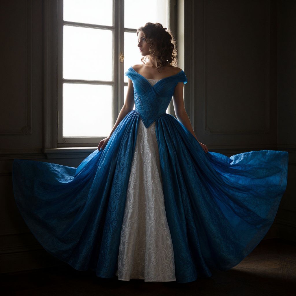 The image depicts a woman in a lush, blue and white dress, standing in a dimly lit room with a window in the background. The dress features intricate textures and a flowing, voluminous skirt that cascades elegantly around her. The woman's hair is styled in loose, wavy curls that frame her face, adding to the overall sense of elegance and grace. The lighting in the room creates a dramatic atmosphere, with light filtering through the window and casting soft shadows, enhancing the depth and dimension of the scene. The woman's posture and the way she gazes out the window evoke a sense of contemplation and introspection, as if she is lost in thought or observing something beyond the frame. The overall composition is balanced, with the woman positioned centrally, and the window serving as a focal point that draws the viewer's eye into the scene. The interplay of colors, textures, and shapes creates a visually rich and emotionally evocative image.