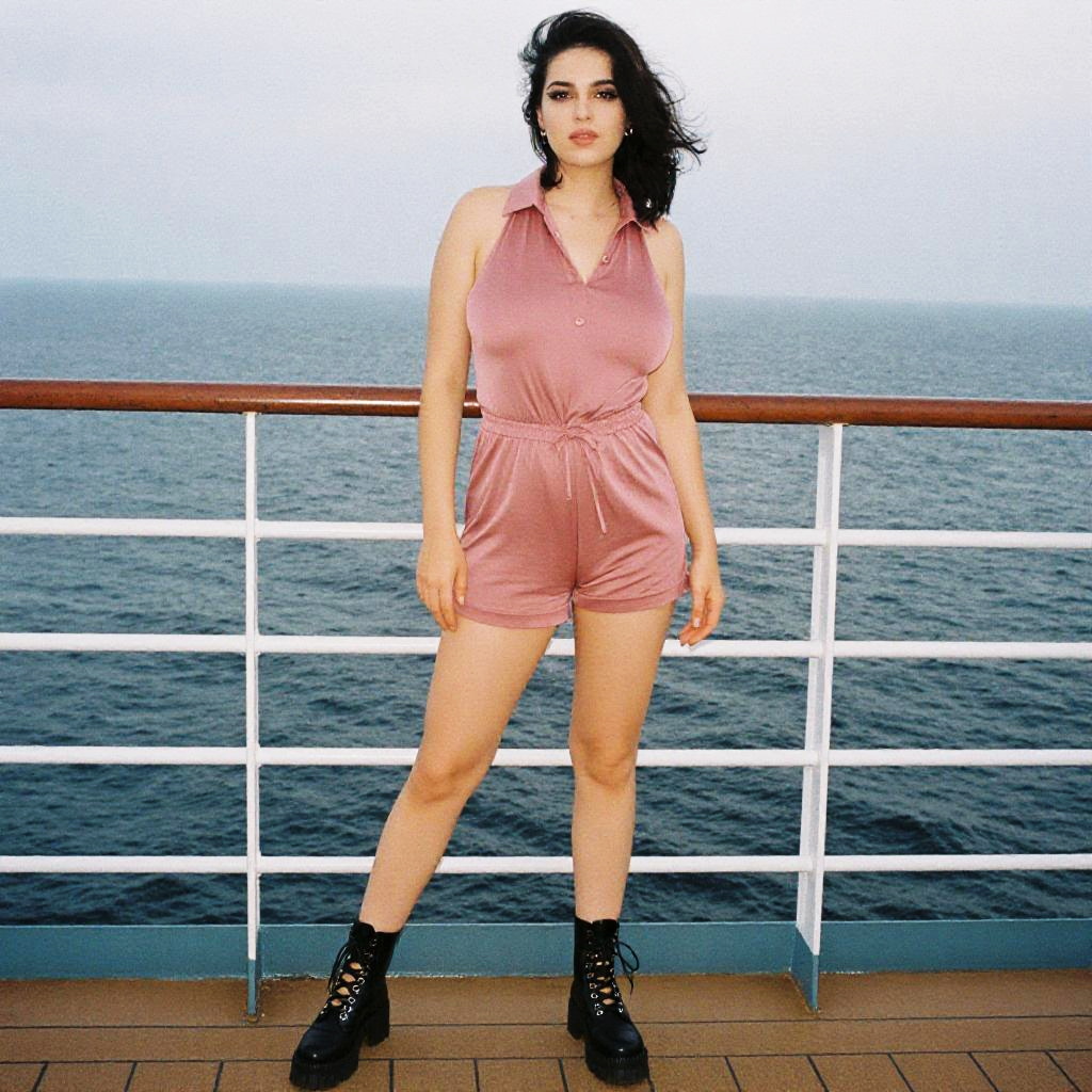 Photograph of a dark-haired woman in a pink romper and black boots, standing on a ship's deck with ocean background.
