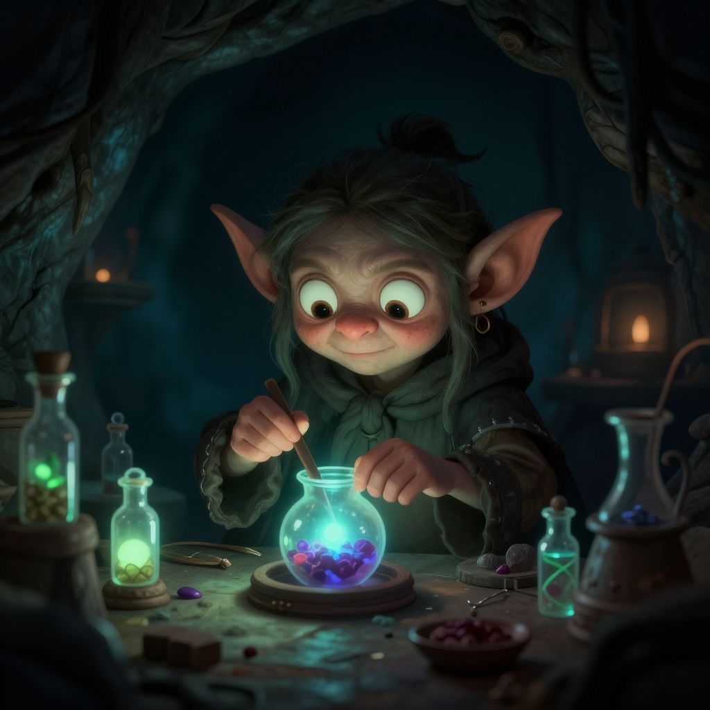Young goblin crafting potions in a dimly lit cave laboratory, glowing vials around, curious expression, small hands busy mixing magical ingredients, dark fantasy illustration