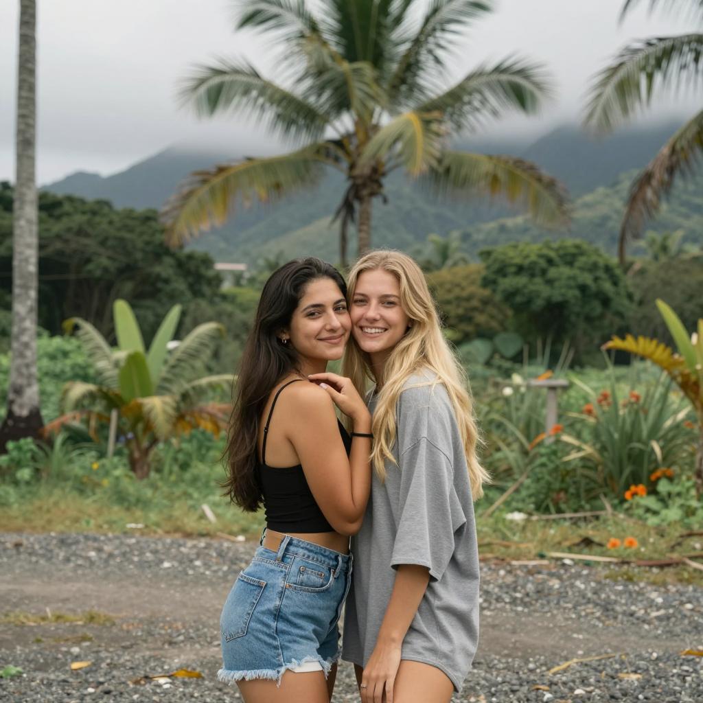 Two women with wet, long hair stand on a rocky beach at sunset. They wear black and striped bikini tops. The woman on the left has her arm around the other's shoulder. Both smile. Palm leaves on the left, ocean waves in the background. Woman on the right waves with her right hand. Both have light to medium skin tones.