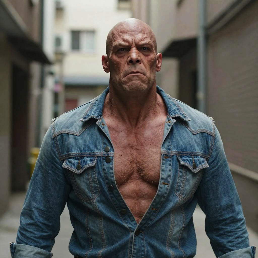 Realistic photo of a ab0m monster man in an alley, opened clothes, deformed face, upper body, detailed, dof