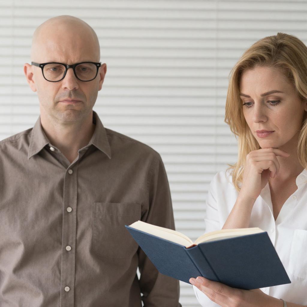 Photograph of two people. Left: balding man with grey beard, furrowed brow, green background, brown shirt. Right: woman with green headband, long brown hair, thinking expression, red background, hand near mouth, brown top.