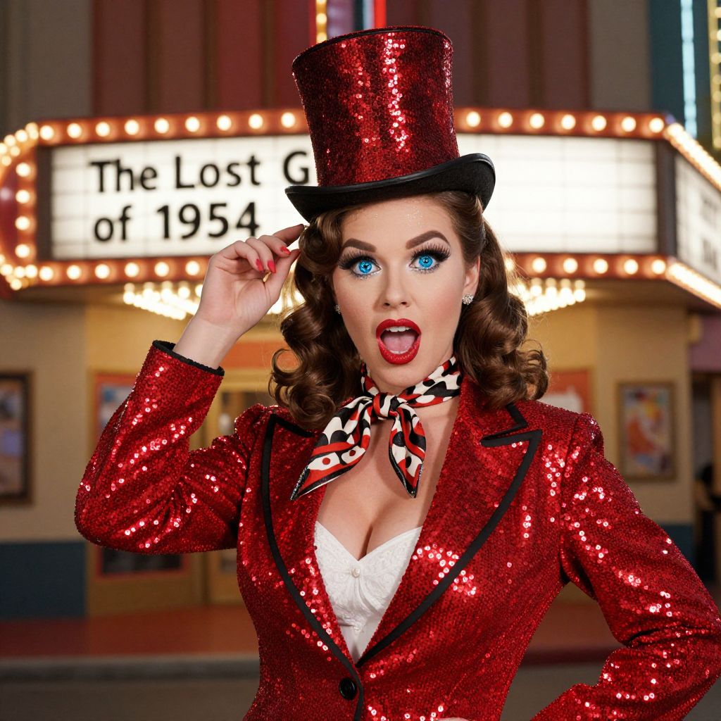 A playful retro aesthetic costume styled after a 1950s Hollywood movie scene: a red sequined tuxedo-style suit with a top hat and a vintage feathered scarf, worn by a youthful woman with red lipstick, a full face of sparkling makeup, and sparkling blue eyes, posing in front of a vintage movie theater with a marquee lighting up 'The Lost Gold of 1954'.. The woman has big tits and cute face