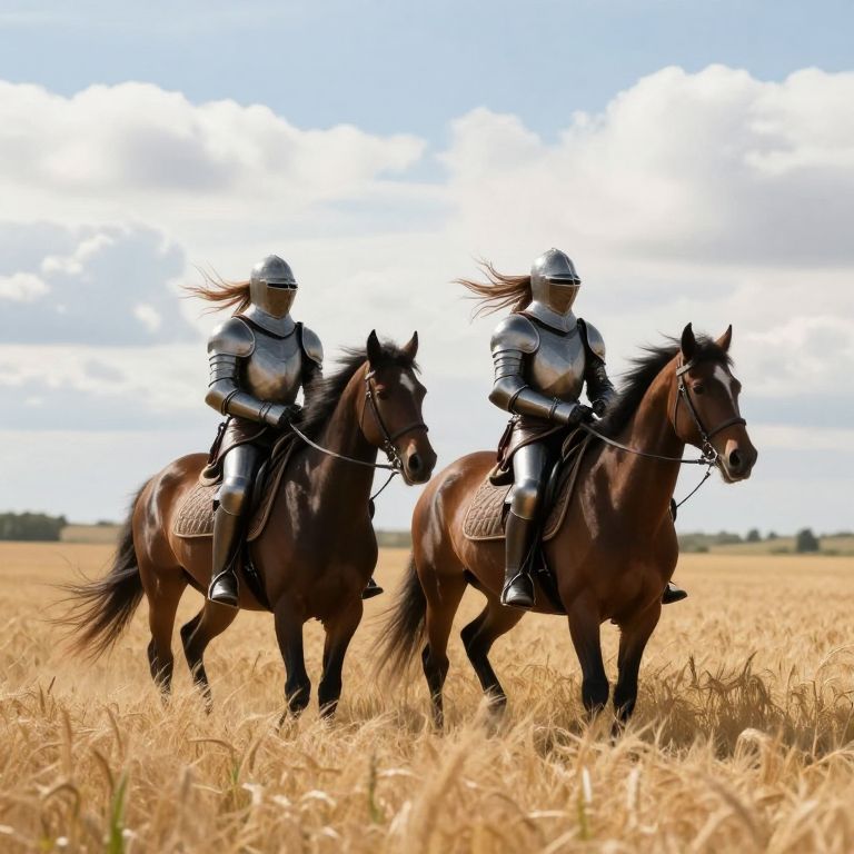 Two armored knights ride side by side through a golden wheat field under a partly cloudy sky, their horses' manes and the flowing hair of one rider billowing in the wind as they traverse the serene landscape.