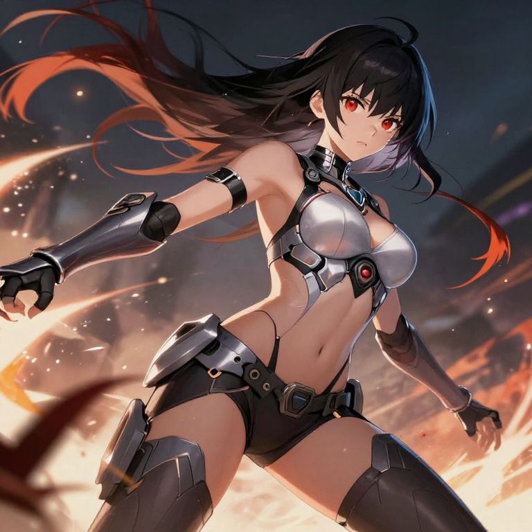 Digital anime-style artwork of a fierce, black-haired, red-eyed female warrior with glowing red highlights in her hair, wearing metallic armor and black shorts,