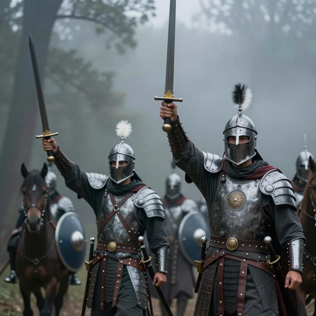 Two medieval knights stand on a dirt path in a dense forest. One knight, dressed in white tunic with leather straps and a helmet, is facing away. The other, clad in black full armor with a red emblem on the chest plate, is holding a sword with blood on the ground near their feet. The scene captures a tense moment in a wooded area with tall trees surrounding them.