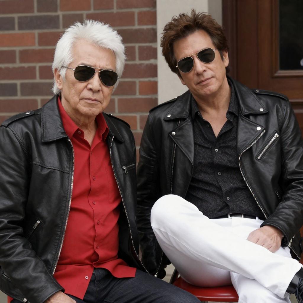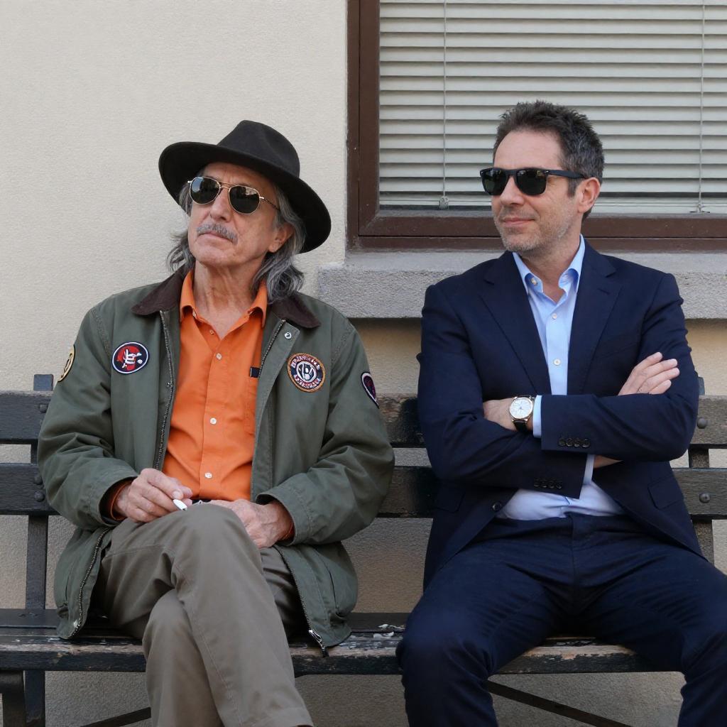 Photograph of three men standing closely together with arms around each other's shoulders. The man in the center wears a white hat, sunglasses, and a light green trench coat. The man on the left has brown hair, wears a striped blue jacket over a purple shirt, and sunglasses. The man on the right has dark brown hair, wears a beige blazer over a light blue shirt, and sunglasses. All three men have relaxed facial expressions. Background includes a window and floral decorations.