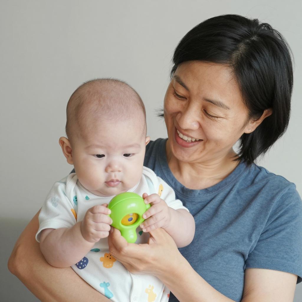 Photograph of a woman with short black hair, smiling, holding a bald baby with light skin. Baby wears colorful onesie, holding green toy. Woman in blue shirt, baby in foreground, neutral ured wall in background. Woman's left hand under baby's arm, baby looking down at toy. Woman's right hand supporting baby's back.
