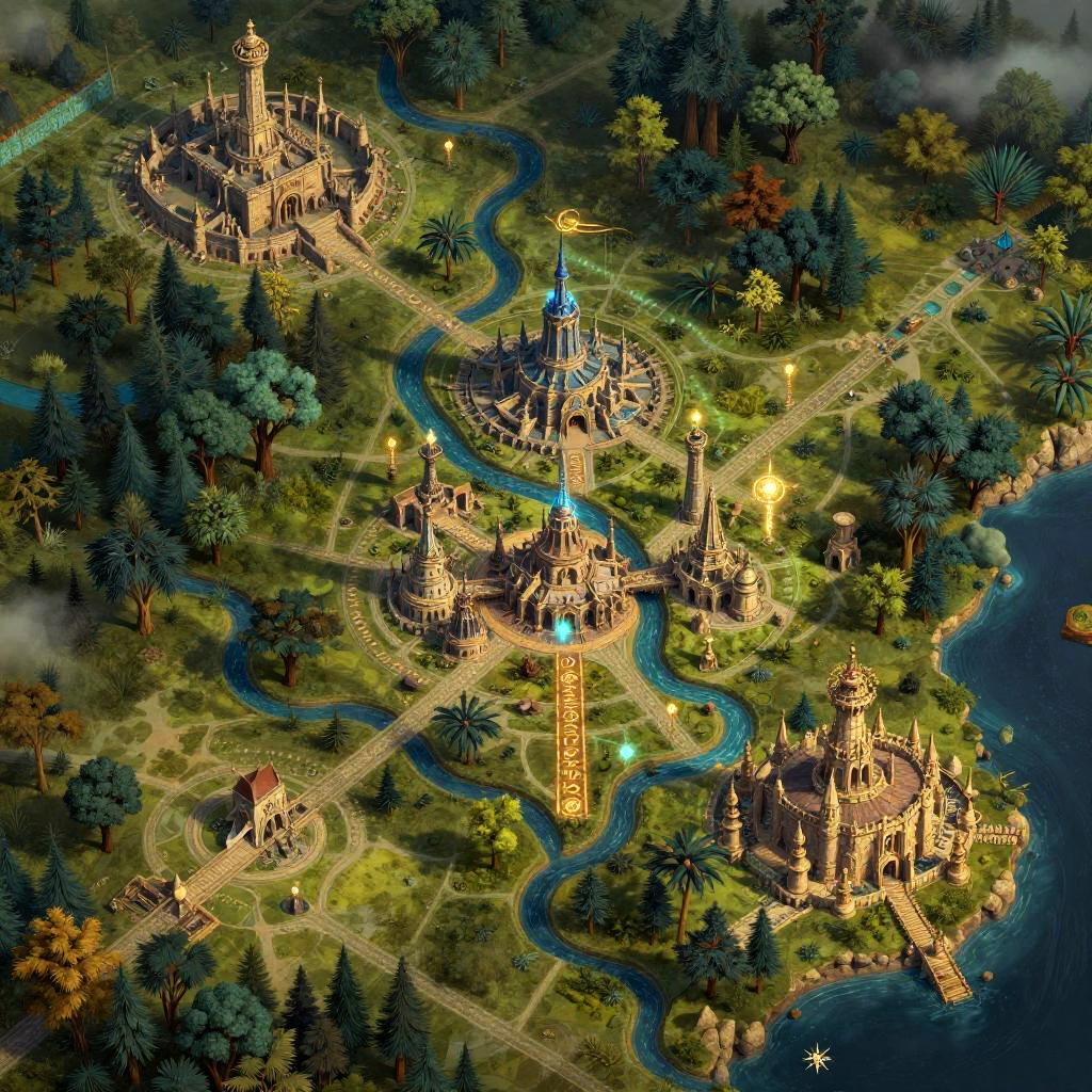 AI map maker DnD, intricate fantasy world map generation with mystical landscapes, ancient forests, winding rivers, and medieval cities, glowing magical runes highlighting key locations, detailed and colorful, high fantasy art style, digital painting.