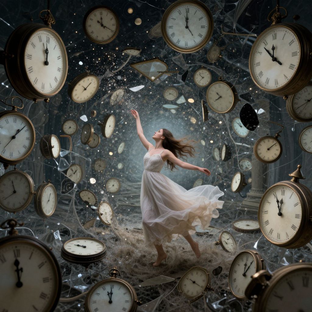 Visualize an ethereal dreamscape where reality and imagination harmoniously blend. In this captivating scene, a graceful young woman stands with composure amidst a swirling maelstrom of time, her form reflected in countless warped mirrors extending infinitely into the distance. These mirrors display clock faces at various stages of distortion and decay, their ticking synchronizing with the murmurs of the wind. As these clocks gradually dissolve into the surrounding elements, they release twinkling fragments of time that pirouette like stardust, forming a mesmerizing tapestry of past, present, and future moments. This dreamlike wonderland exudes an enchanting atmosphere, inviting viewers to immerse themselves in its hypnotic dance between reality and imagination.