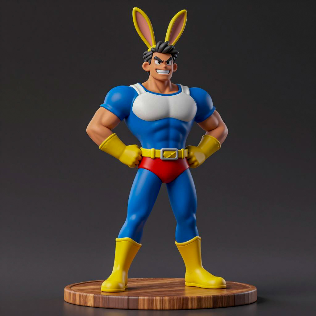 3D statue of a muscular male character with yellow bunny ears, wearing a blue, red, and white superhero costume with yellow boots and gloves. He stands on a wooden base, hands on hips, grinning intensely. Dark background. Realistic style.