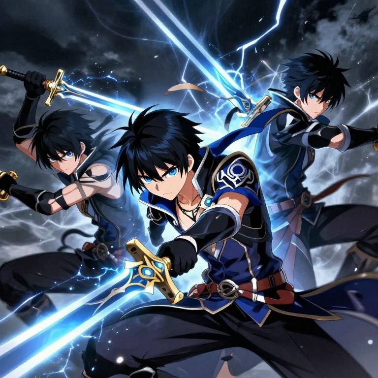 Dynamic anime-style digital artwork of four warriors in battle gear, holding weapons, with intense sunlight and debris in the background.