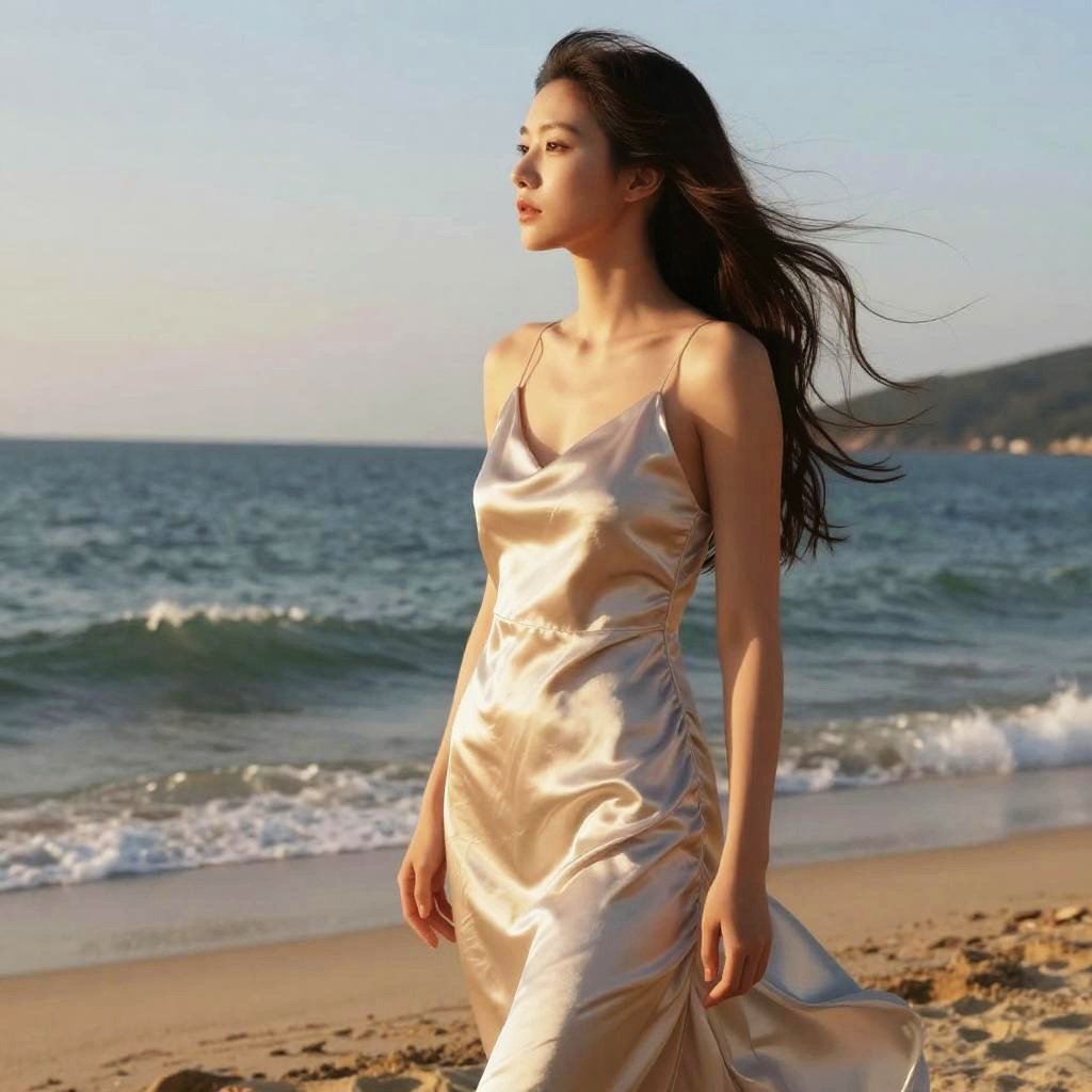 Hanni sexy beach scene, golden hour sunlight, flowing silk dress, wind blowing hair, serene ocean backdrop, warm tones, natural beauty emphasis, photorealistic rendering