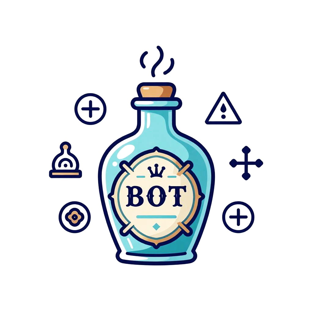 Potion logo, vintage apothecary bottle with intricate label, steam rising, alchemical symbols around, vibrant colors, fantasy theme, clean modern vector style