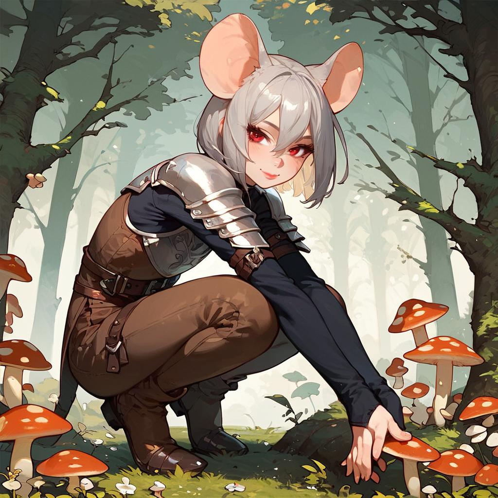 5 fingers, score_9, score_8_up, score_7_up, score_6_up, score_5_up, score_4_up, source_anime, side view, fungus, mushroom, forest, tree, female, solo, humanoid, not furry, mouse humanoid, bob cut, grey hair, (hair between eyes:1.1), red eyes, looking at viewer, smile, flat chested, crouching, leather armor, long sleeves, brown pants, medieval clothes