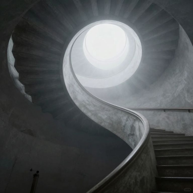 Photograph of a spiral concrete staircase leading upwards to a bright circular skylight at the top. The staircase curves to the right, with smooth, gray concrete walls and steps. The skylight emits a stark white light, creating a dramatic contrast with the dark, shadowy staircase below. The texture of the concrete appears rough, with visible shadows and light reflections enhancing the depth and curvature of the staircase. The composition emphasizes the interplay between light and shadow, creating a sense of depth and movement.